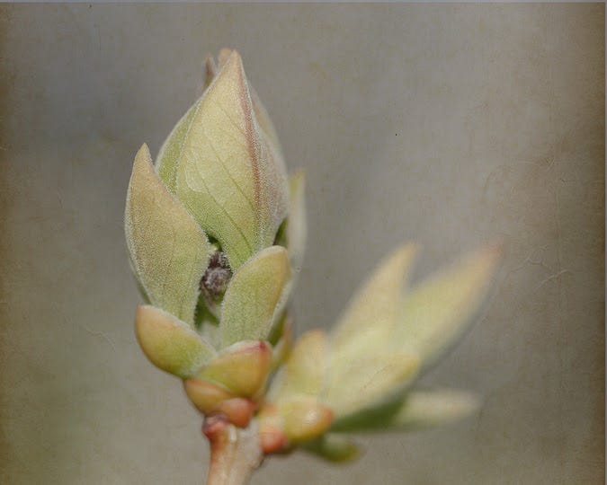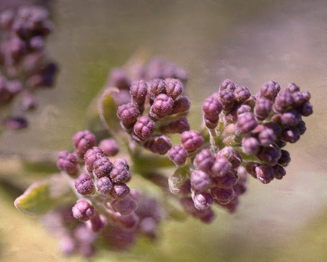 Buds are barely starting to form on lilac bushes in our front yard. Gerry keeps watch and updates me daily. A few years ago I captured images from the barely-budding bush in our backyard British Columbia through to the end of flowering. Paying attention through the lens of my camera extended the season for me. I recommend it as a practice.